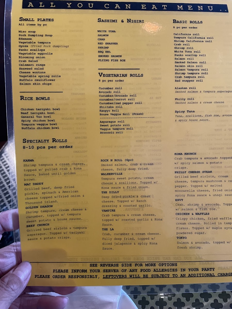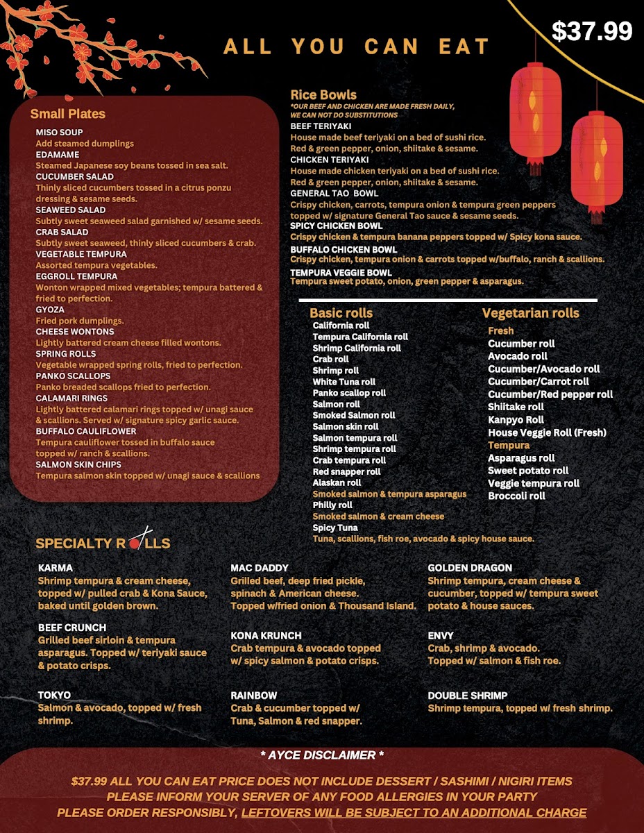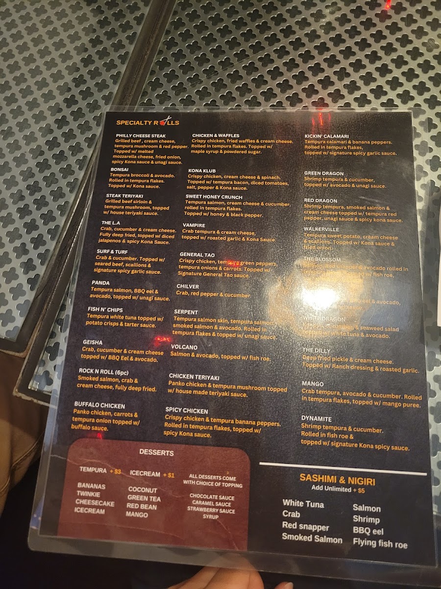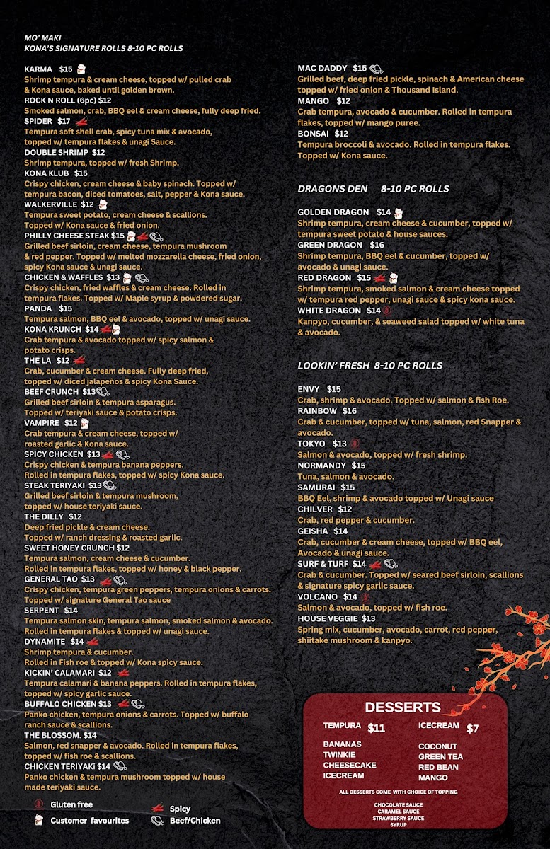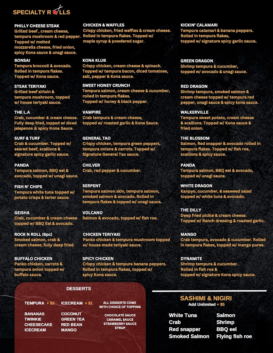 GOLDEN DRAGON Shrimp tempura, cream cheese & cucumber, topped w/ tempura sweet potato & house sauces. KARMA Shrimp tempura & cream cheese, topped w/ pulled crab & Kona Sauce, baked until golden brown. THE LA Crab, cucumber & cream cheese. Fully deep fried, topped w/ diced jalapenos & spicy Kona Sauce. ROCK N ROLL Smoked salmon, crab, BBQ eel & cream cheese, fully deep fried. CHICKEN & WAFFLES Crispy chicken, fried waffle & cream cheese. Rolled in tempura flakes. Topped w/ Maple syrup & powdered sugar. CALIFORNIA Crab, cucumber & avocado. THE DILLY Deep fried pickle & cream cheese. Topped w/ Ranch dressing & roasted garlic. CUCUMBER & AVOCADO SWEET POTATO