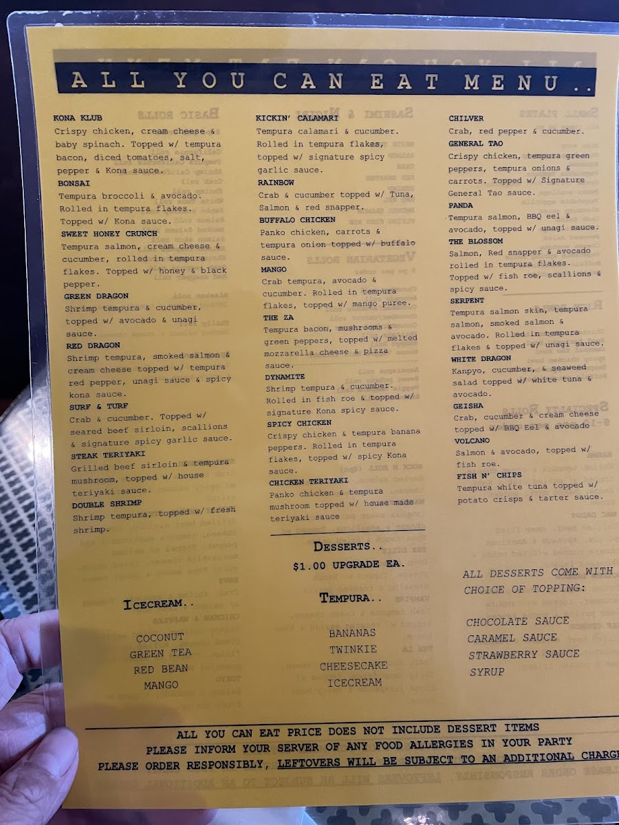 In addition to sushi rolls and appetizers, Kona Sushi offers a variety of rice bowls, desserts, and beverages to round out your meal. The Tempura Twinkie and Tempura Cheesecake are unique and indulgent dessert options that are sure to satisfy your sweet tooth.