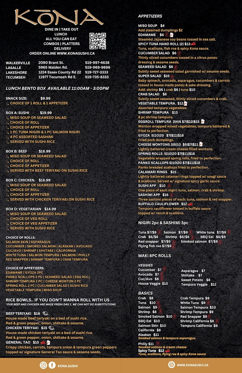 Welcome to Kona Sushi - Walkerville, located at 1801 Wyandotte St E in Windsor, ON. This vibrant eatery offers a diverse menu of Japanese cuisine, with a focus on sushi and creative rolls.